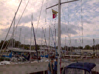Skip put our new flag up. Our old American flag was a bit faded and tatered. He also worked on the mian sail ribs, changing out the screws..